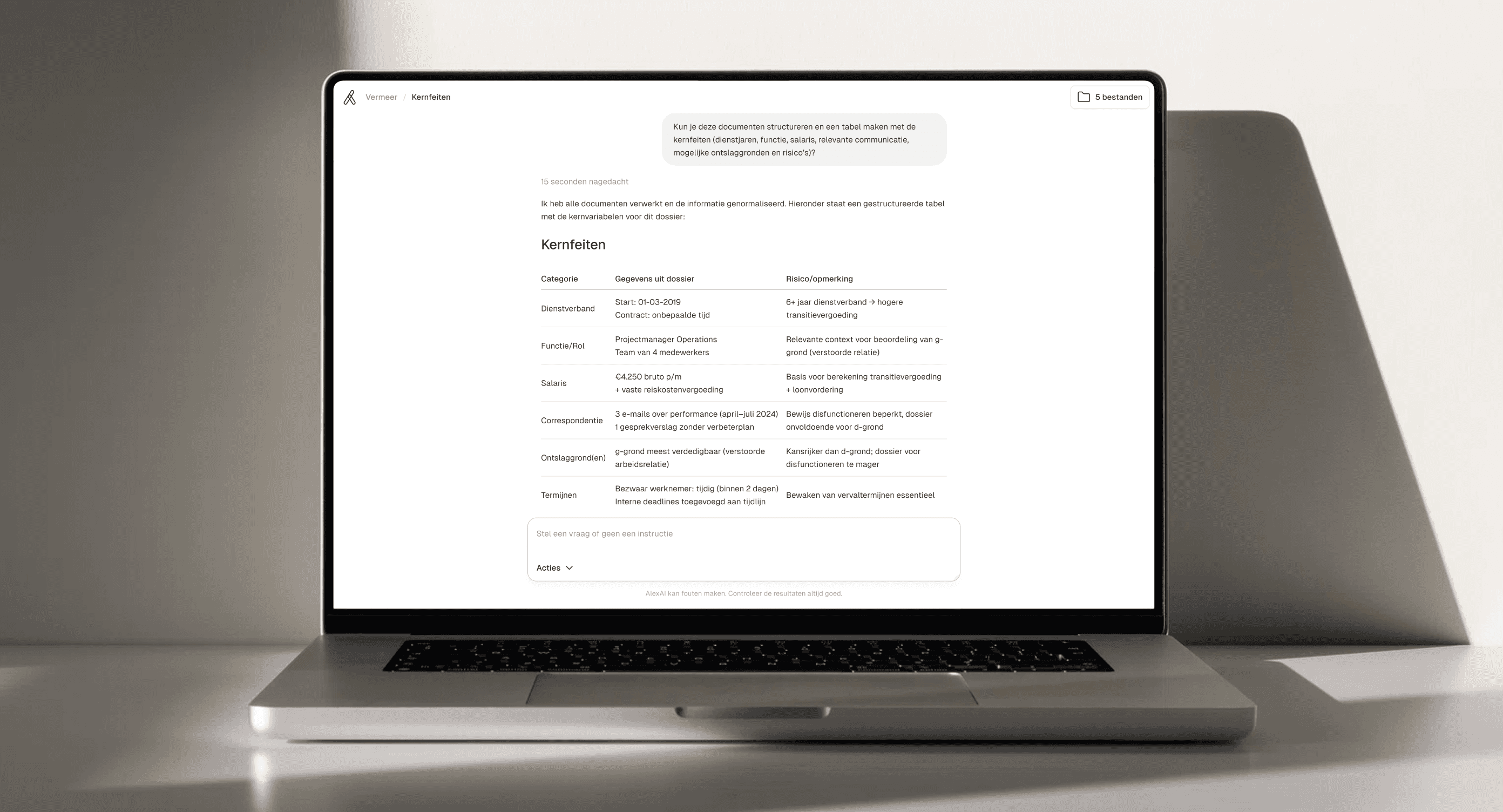 Alex verwerkt de stukken, vult ontbrekende kerngegevens aan (functie, salaris, data), bouwt een tijdlijn, vergelijkt de routes (onderhandelen, bezwaar, UWV/kantonrechter) en genereert direct een conceptbrief of cliëntenmemo. Zo heb je binnen enkele minuten de basis voor de juiste vervolgstap.