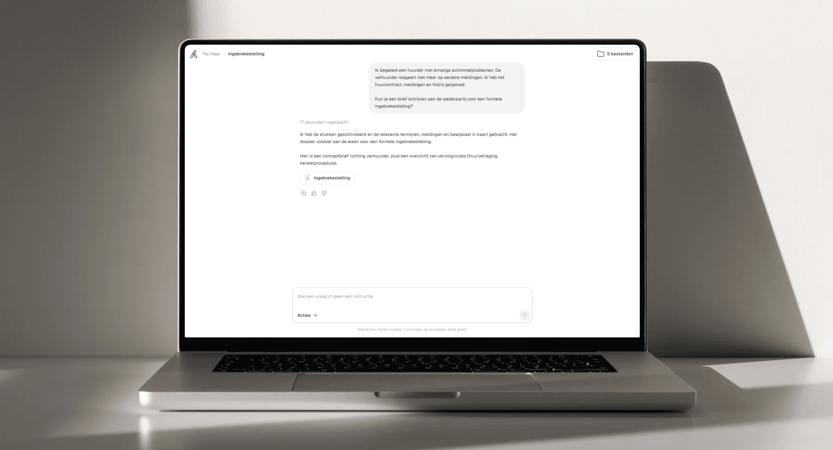 Alex controleert de meldingen en termijnen, vult ontbrekende data aan, maakt een tijdlijn en vergelijkt de opties: ingebrekestelling, huurverlaging of een spoedprocedure. Vervolgens genereert het direct een conceptbrief en plant het opvolgacties, zodat je niet blijft hangen in eindeloos heen-en-weer mailen.